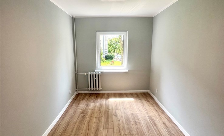 Mieszkanie położone jest na parterze w niskim bloku z cegły i składa się z trzech przestronnych pokoi, kuchni i łazienki.